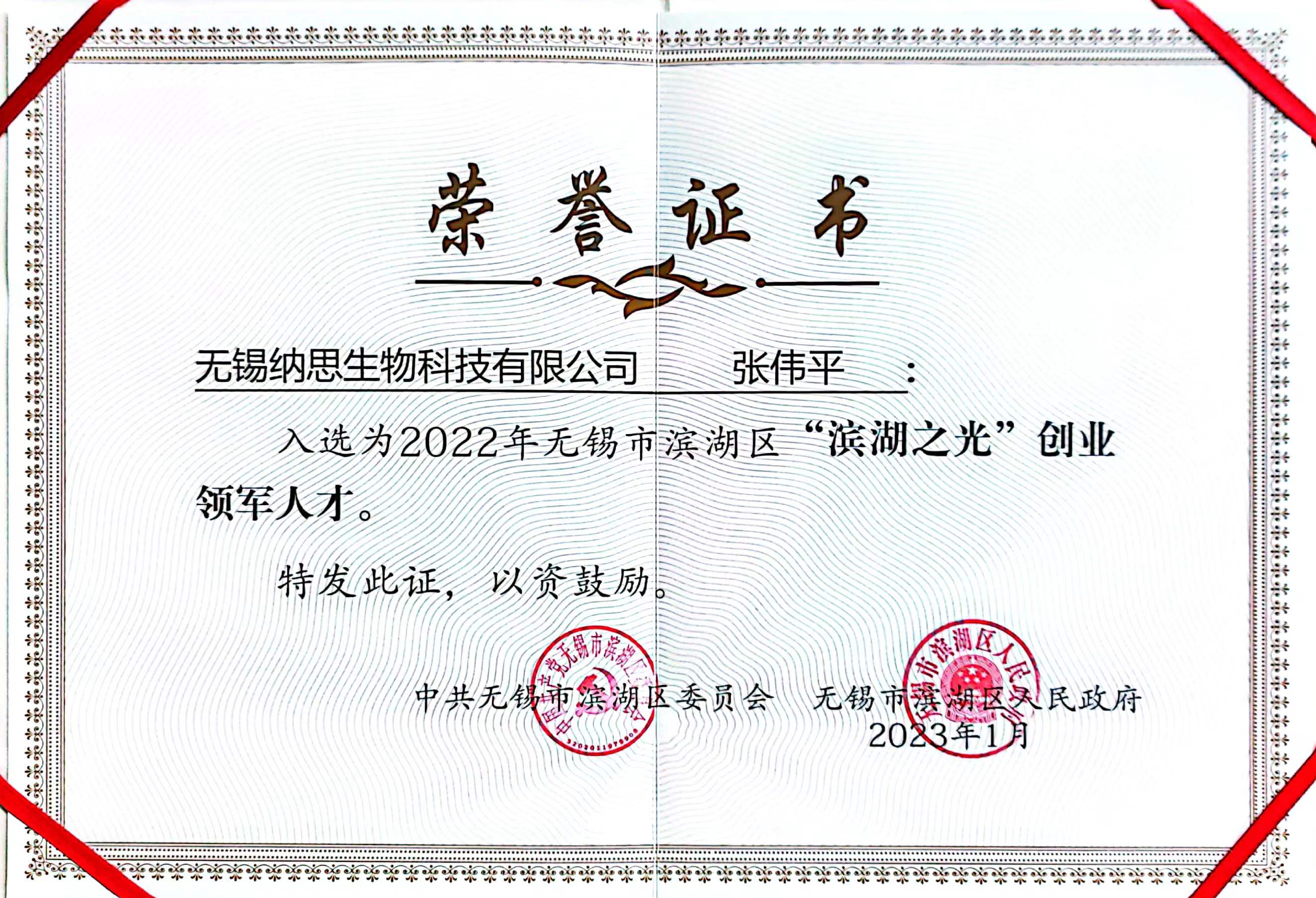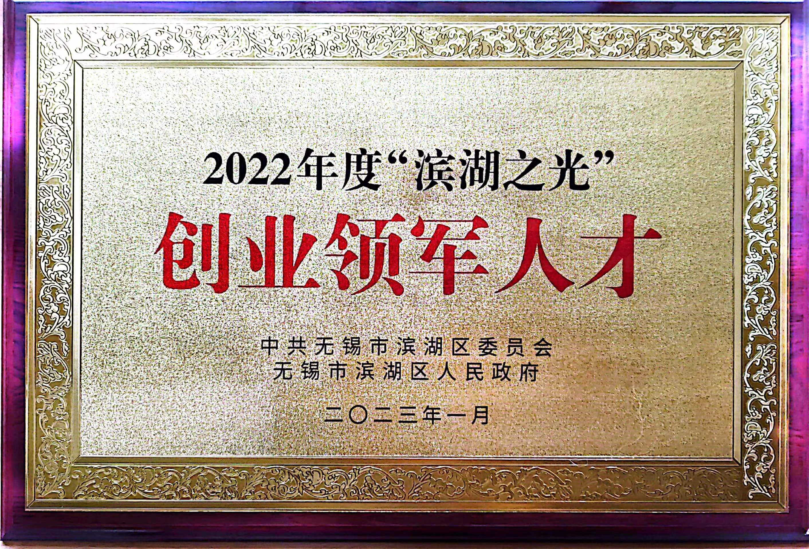 獲得無錫市濱湖區(qū)"濱湖之光·創(chuàng)業(yè)領(lǐng)軍人才“稱號(hào)