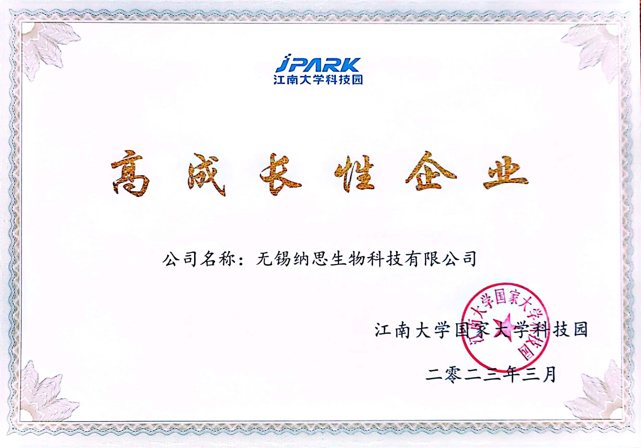 獲得江南大學(xué)科技園“高成長(zhǎng)性企業(yè)”稱號(hào)